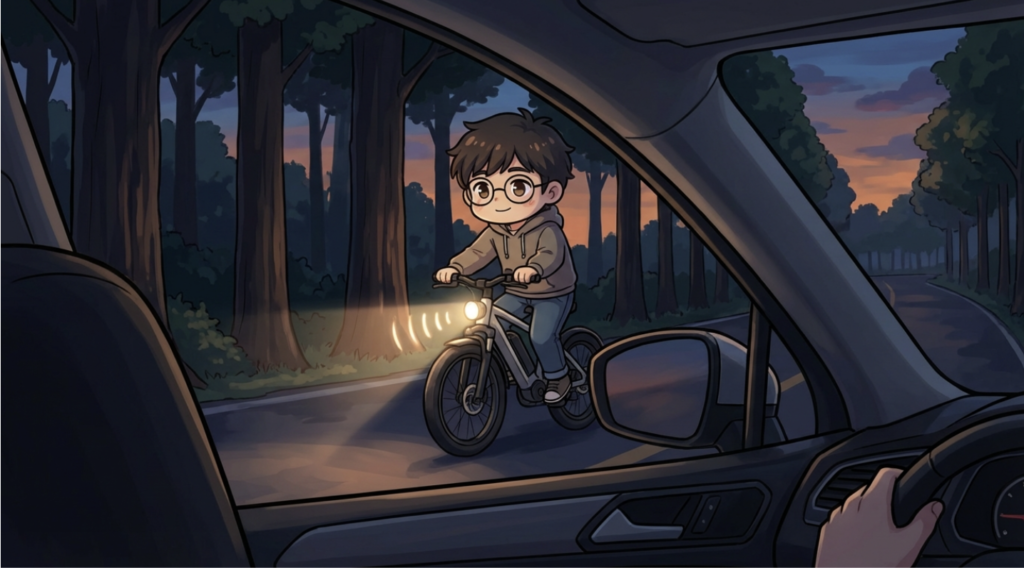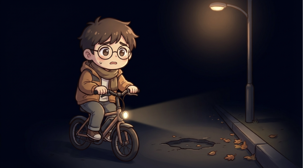 夜間や夕暮れ時の自転車事故で最も多いパターンは、ドライバーが「自転車に気づかなかった」というもの。コンビニで売っている安価なライトでは、濡れた路面や路肩の段差が見えないだけでなく、周囲の車や歩行者からの視認性も不十分なのが現実です。