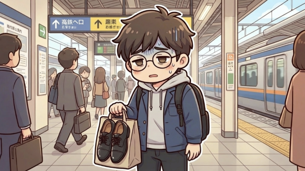 そこで私は数年前から、「移動用スニーカー + 会場用革靴」の2足持ちスタイルを採用していました。でも、これはこれで問題が…