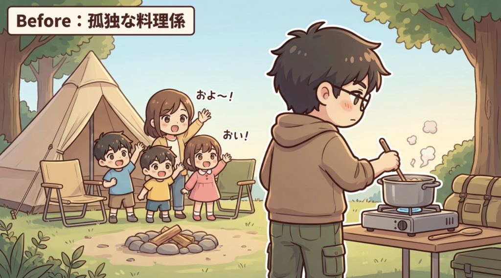 家族団らんのためにキャンプに来ているのに、料理中はずっとテントの隅でコンロに向かい合い、家族に背中を向けている。「パパ、まだー?」という声に、背中で「もうちょっと!」と答えるだけの孤独なシェフ状態。
