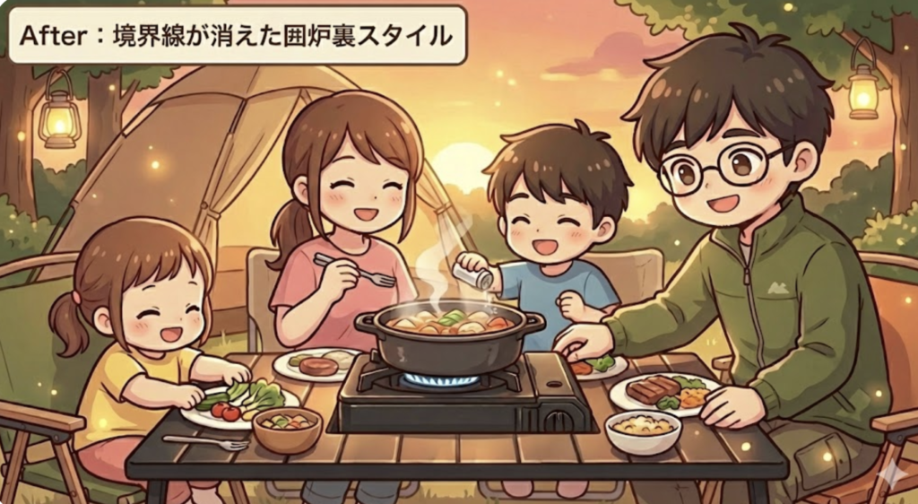 After: 家族みんなでテーブルを囲み、その中心にコンロがある「囲炉裏スタイル」