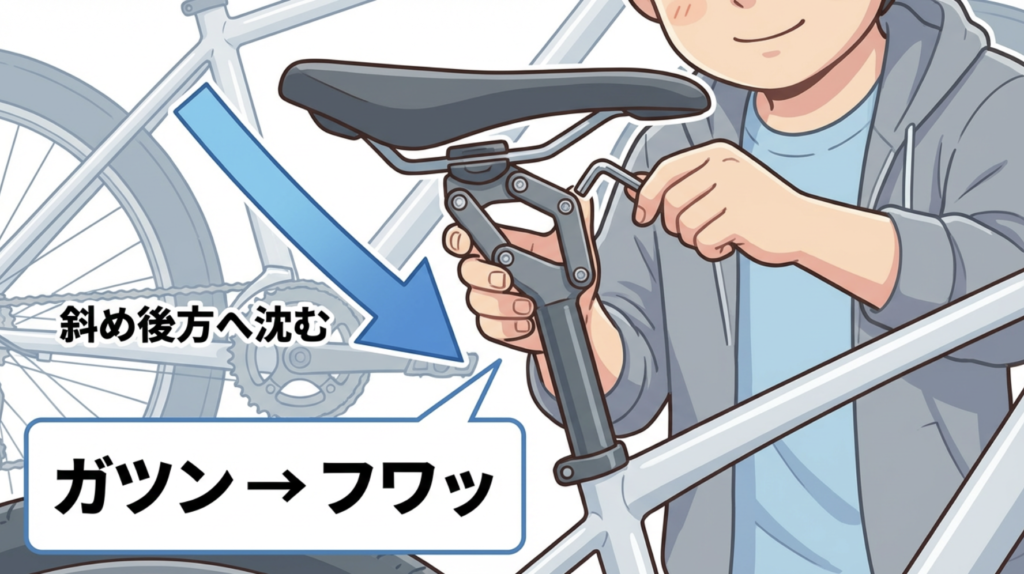 通常のサスペンションは真上に沈み込みますが、NCXは**「斜め後ろ下方向」**に動きます。これが非常に重要なポイントです。自転車が段差を乗り越える際、衝撃は前方から来ますが、このシートポストはその衝撃に合わせてお尻を後方に逃がしてくれるのです。
