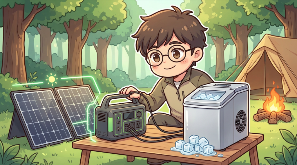 - 日中:ソーラーパネルでポータブル電源を充電しながら必要に応じて製氷