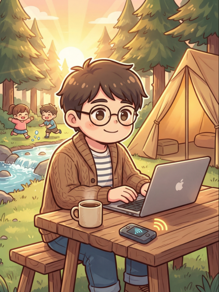 でもZEUS Wi‑Fiがあると、キャンプ場の朝でもPC作業がサクサク進む。