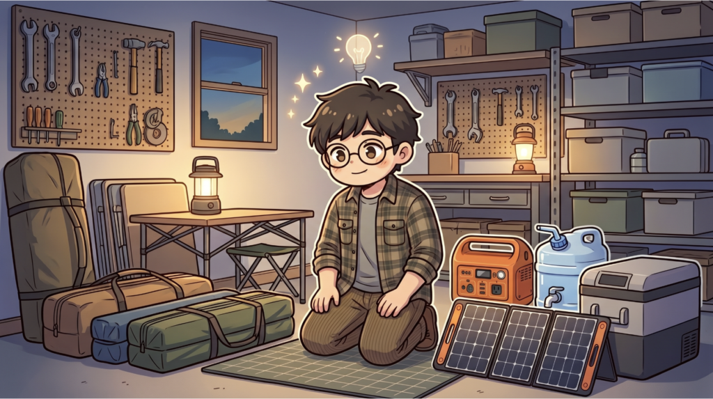我が家レベルのフル装備が揃っていると、正直、市販の「防災リュック一式」を買い足す意味はかなり一時的になります。 理由はシンプルで、一応「電気」「水」「寝」「調理」「保冷」「機動力」の体制を、家の中に一式持っているからです。