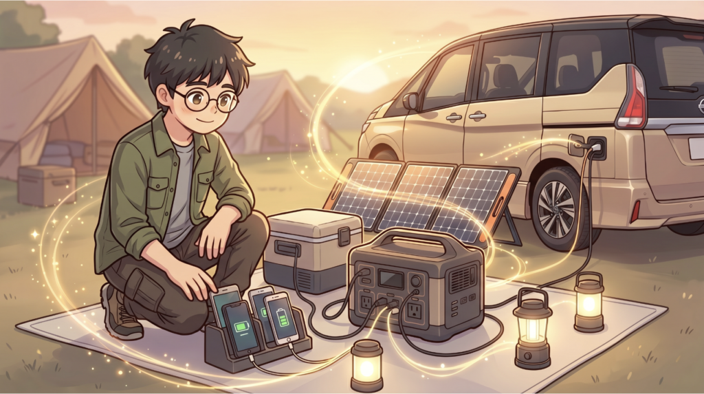 実は我が家では、ポータブル電源とセレナの車載電源という**「二重の電源バックアップ」**が自然に構築されています。