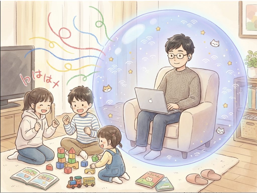 目の前では子どもが遊んでいても、耳の中は自分の作業部屋。環境を変えずに、集中だけを取り戻せる。怒鳴る理由が消える