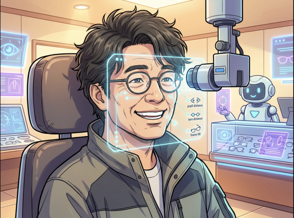 測定台に座ると、AIシステムが私の動きを捉えます。黒目の位置、フレームの傾き、目とレンズの距離…。